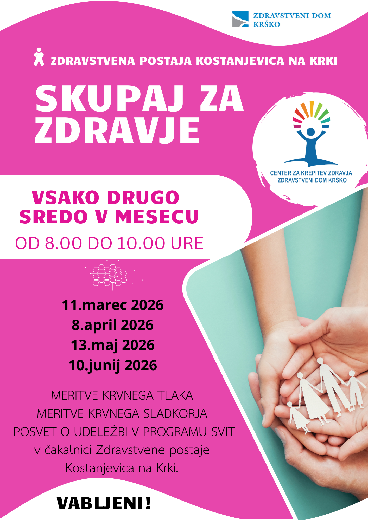 V Kostanjevici na Krki se bodo od marca do junija, vsako drugo sredo v mesecu med 8.00 in 10.00, izvajale aktivnosti Skupaj za zdravje, namenjene spremljanju in ohranjanju zdravja.